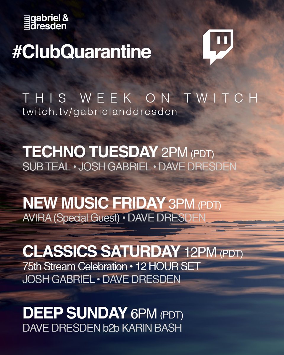 Gabriel Dresden Twitterren This Week On Club Quarantine Highlights Early 2pm Pdt Techno Tuesday With Sub Teal Gabriel Dresden Avira Guest Mix On Friday Josh Gabriel Dave Dresden Classics Only