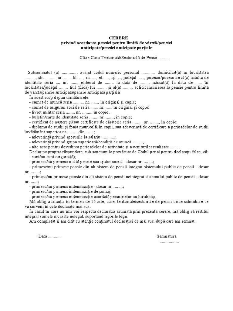 Declaratie pe propria raspundere pentru pensie pentru limita de varsta. Dosarul astfel intocmit trebuie depus in termen de 30 de zile de la data la care solicitantul a indeplinit conditiile de pensionare. Ministerul Muncii a transmis luni ca nu exista discutii in Guvern cu privire la majorarea stagiului minim de cotizare pentru pensie si nici nu doreste eliminarea pensionarii anticipate. Declaratie pe propria raspundere data prin reprezentantul legal al angajatorului din care sa rezulte ca persoanele cu handicap nu sunt incadrate pe locuri de munca devenite vacante ca urmare a incetarii raporturilor de munca sau de serviciu prin acordul partilor la initiativa angajatorului pentru motive care nu tin de persoana angajatului ori dupa caz prin eliberare din.